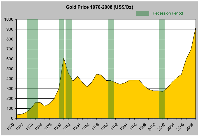 Dari penelitin harga emas yang dilakukan WGC selama masa-masa resesi yang terjadi antara Nov 73- Maret 73 ; Jan 80- Jul 80; Jul 81-Nov 82 ; Jul 90- Nov 91 dan Mar 01-Nov 01 ; ternyata terbukti harga emas secara global tidak terpengaruh oleh resesi-resesi tersebut.